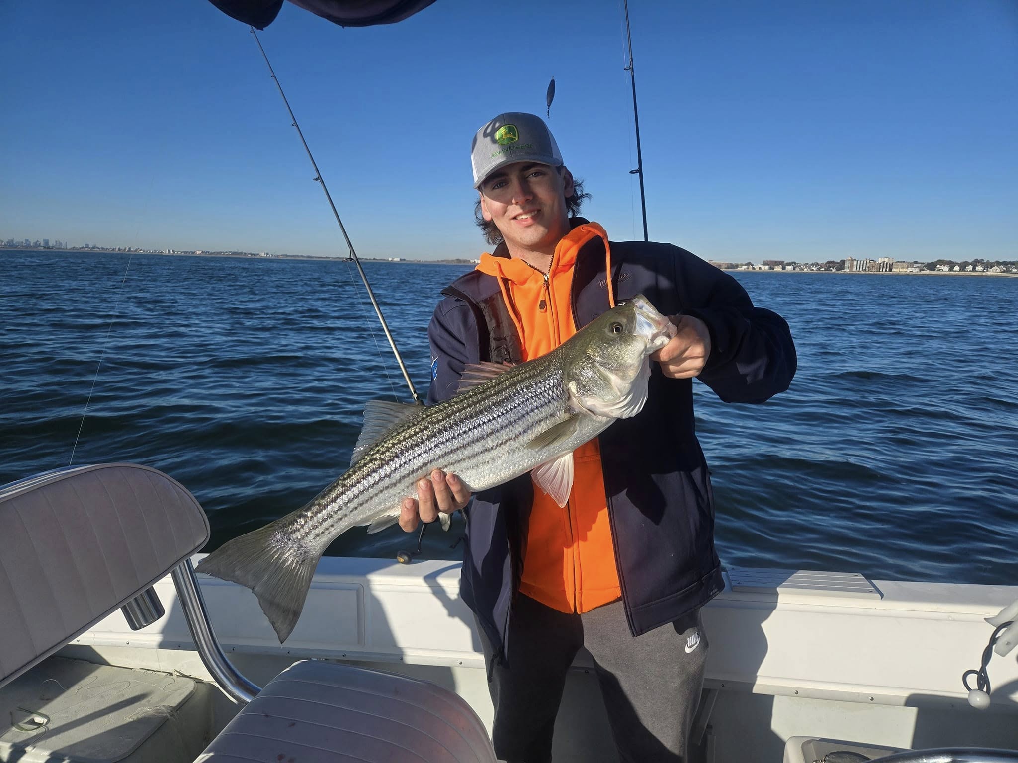 Striped Bass are the crown jewel of Boston Harbor fishing, and for good reason. These fish can range anywhere from schoolie size around 18-20 inches up to genuine keeper bass pushing 30+ inches and 10+ pounds. What makes Stripers so special is their fighting ability – they'll make strong runs and put a serious bend in your rod. The best action typically happens during the spring and fall migrations when schools move through the harbor feeding heavily. Summer fishing can be excellent too, especially early morning or evening when the fish move into shallower water to hunt. Kids absolutely love the fight these fish put up, and there's nothing quite like seeing a young angler's face light up when they feel that first solid hookup. Boston Harbor bass are also known for their quality – these fish feed on abundant baitfish and crustaceans, making them both healthy and great eating if you decide to keep a few within the regulations.